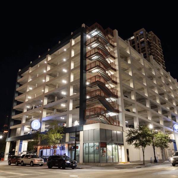 Conveniently located steps from Jones Hall and Wortham Center. Features restaurants at ground level, including The Lucky Italian and Space City Birria Toacos and More. Open 24 hours.